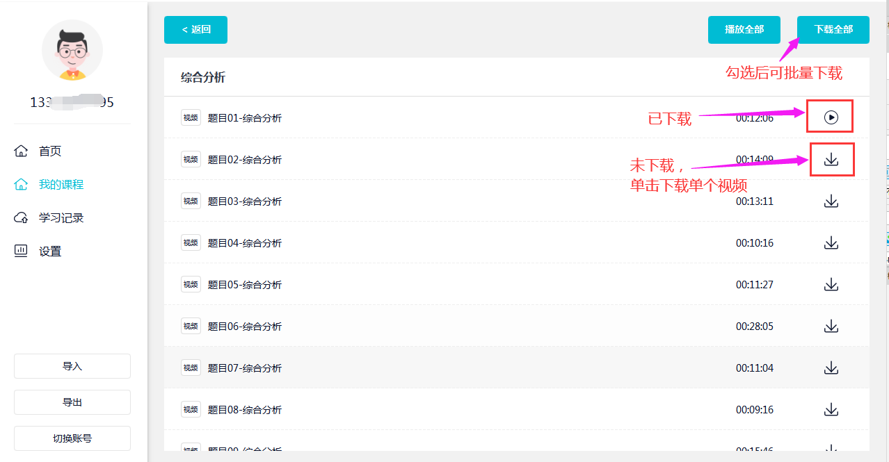 (2)點(diǎn)擊學(xué)習(xí)進(jìn)入視頻課列表,下載視頻后可在APP內(nèi)觀看,點(diǎn)擊“下載全部”支持批量課件下載。