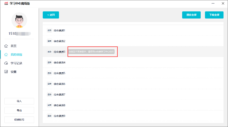 (4)離線播放器暫不支持觀看直播課、回放視頻等操作,點(diǎn)擊課程播放時(shí)會(huì)提示該類型不支持顯示,請(qǐng)使用瀏覽器在線觀看。