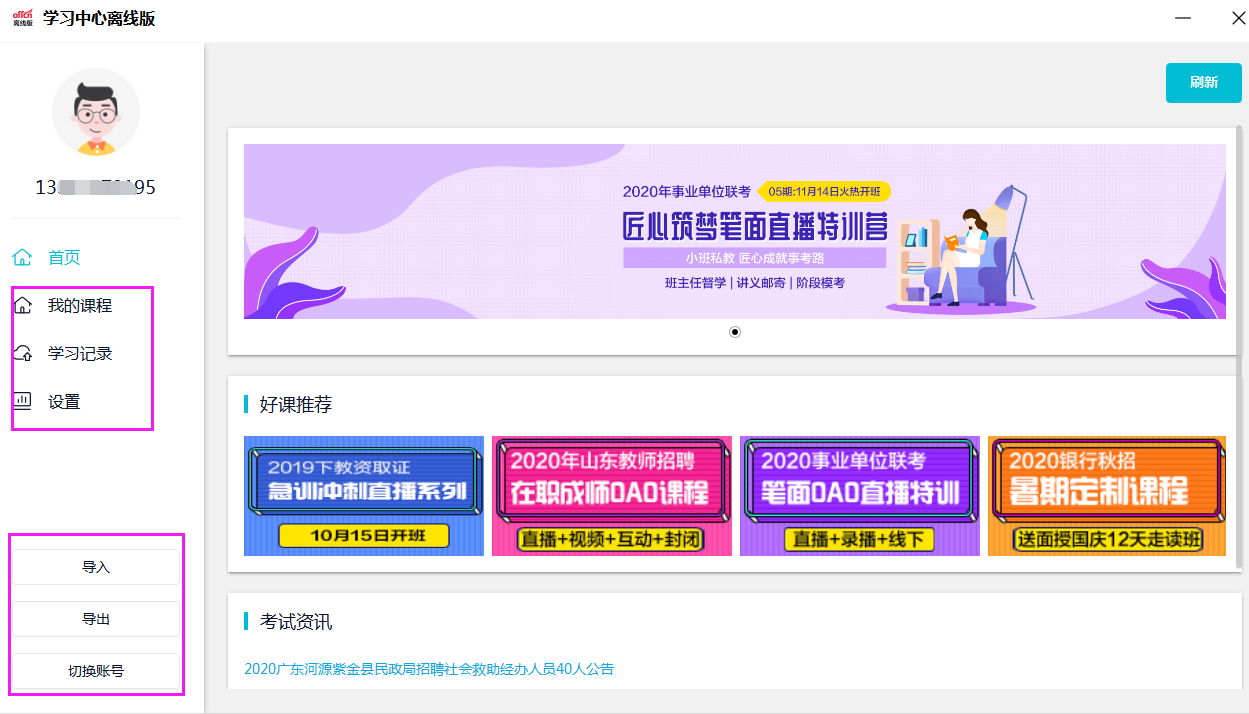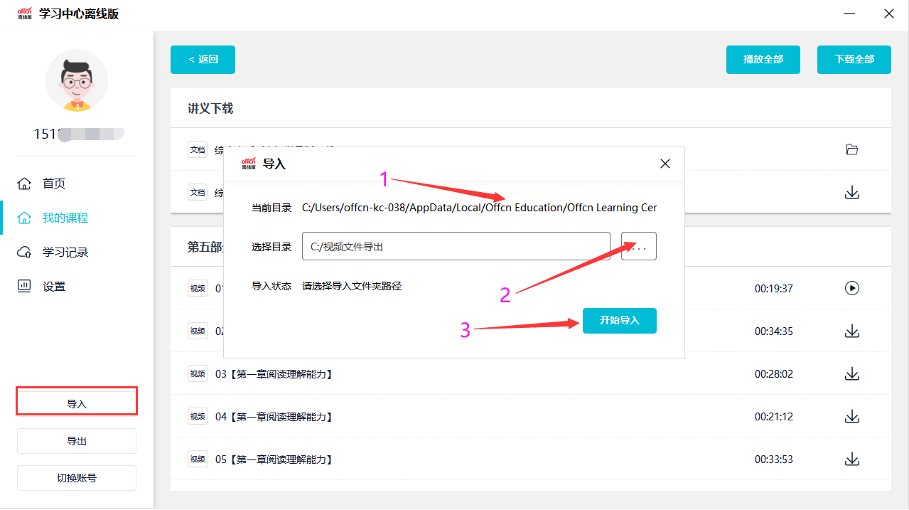 (4)導(dǎo)入:可通過之前下載保存的視頻文件(注:電腦上離線客戶端下載的視頻課件)導(dǎo)入到另一臺(tái)電腦上(需安裝離線客戶端);