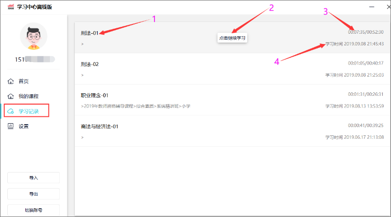 點(diǎn)擊界面左側(cè)學(xué)習(xí)記錄標(biāo)簽頁,打開學(xué)習(xí)記錄界面,點(diǎn)擊該條記錄可打開視頻播放界面,并按照上次觀看進(jìn)度繼續(xù)播放該視頻。