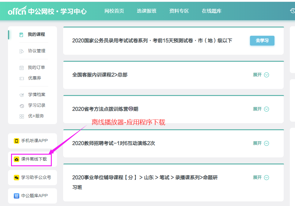 方法二:電腦登錄中公網(wǎng)校學(xué)習(xí)中心(http://xue.eoffcn.com/web/),點(diǎn)擊左側(cè)的“課件離線下載”,進(jìn)行下載安裝。