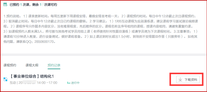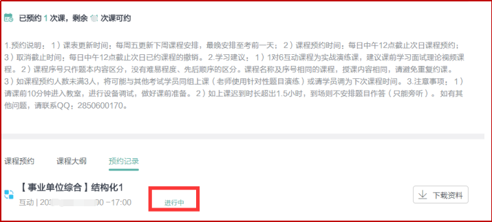 操作方法:登錄進(jìn)入"互動(dòng)課程首頁",從"預(yù)約記錄"中可以查看已經(jīng)上課的課程記錄,每次課程記錄中可以顯示參加的練習(xí)日志和下載本次課程的場(chǎng)外題目。