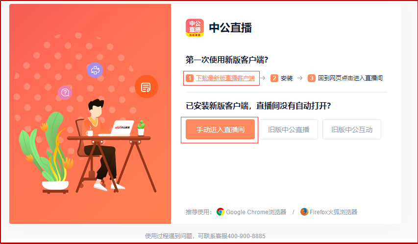 如登錄教室上課,請(qǐng)"下載中公直播客戶端";如已進(jìn)入過教室,已經(jīng)安裝中公直播客戶端,請(qǐng)選擇"點(diǎn)擊手動(dòng)進(jìn)入直播間"直接進(jìn)入教室。