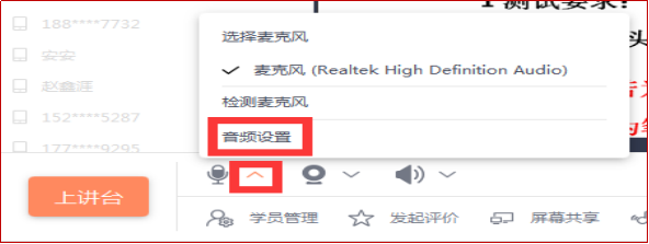 (1)操作:進(jìn)入教室后點(diǎn)擊左下角麥樂風(fēng)旁邊的下三角,“音頻設(shè)置”里即可進(jìn)行設(shè)備檢測(cè)