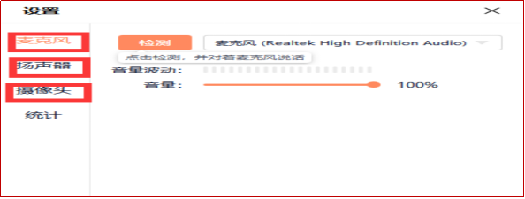 測(cè)試說明:請(qǐng)依次選擇"麥克風(fēng)、揚(yáng)聲器、攝像頭"進(jìn)行試音、試聽、預(yù)覽,根據(jù)提示依次進(jìn)行(如個(gè)人網(wǎng)絡(luò)不好,不建議開啟視頻,會(huì)對(duì)您的語音音頻有一定的影響)。