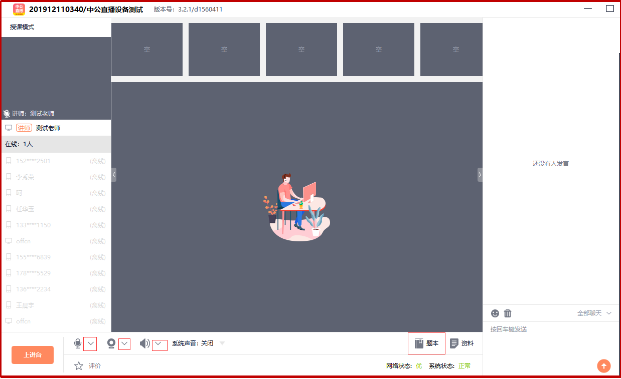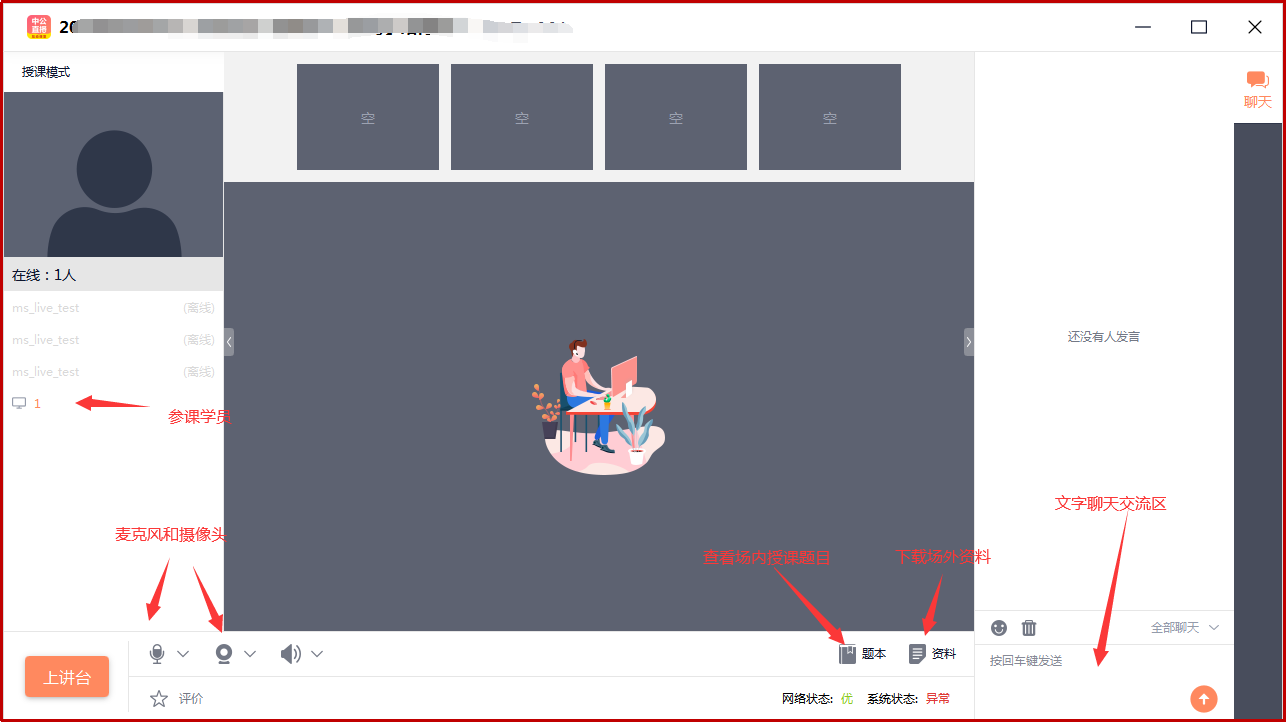 登錄后,教室顯示為如圖形式,教室內(nèi)布局及功能詳解: