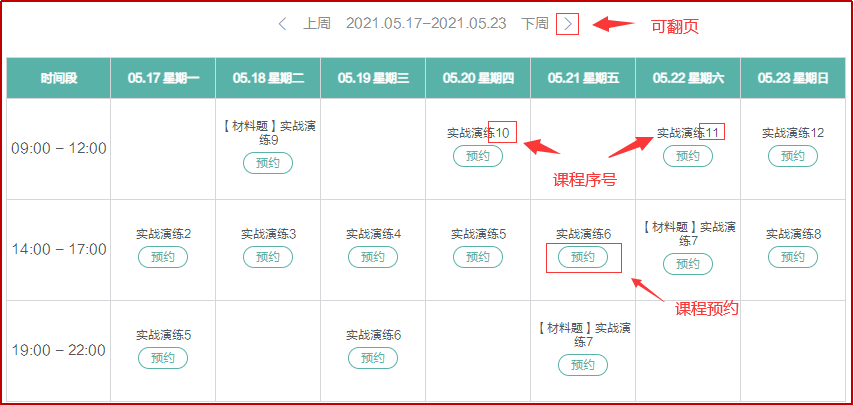 (3)課表時(shí)間段有可翻頁(yè)的選項(xiàng),可以進(jìn)行近一周的課程安排。課表是循環(huán)安排,每周五更新下一周課表,課表持續(xù)更新至考前;