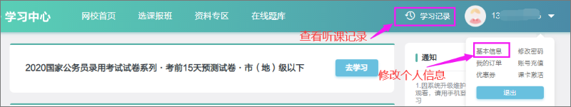 點擊右上角帳號▽,通過點擊“基本信息”可以修改個人信息(修改直播間昵稱,可通過修改“姓名”后重新登錄聽課中心),個人聽課記錄可以通過“學(xué)習(xí)記錄”點擊查看。