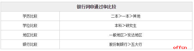 最后從銀行方面比較,五大行的網(wǎng)申相對(duì)較難,股份制銀行更容易通過(guò)。