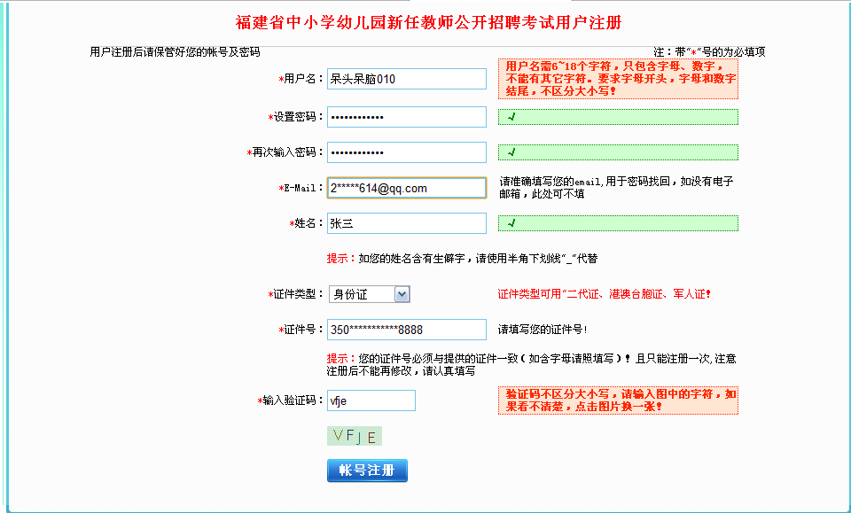 每人(按一個身份證號)只能選擇1個招聘崗位(即1個縣〈市、區(qū)〉)招聘考錄單位,注意每個身份證號只能注冊一個賬號,且考生應(yīng)牢記該賬號和密碼,避免后期由于遺忘賬號造成準(zhǔn)考證無法打印或成績無法查詢。