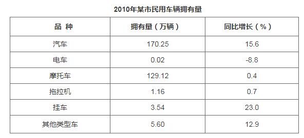 2010年末,某市民用車輛擁有量達(dá)309.7萬輛,同比增長8.7%,其中,進(jìn)口車擁有量12.54萬輛,增長43.2%。