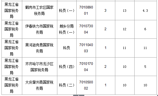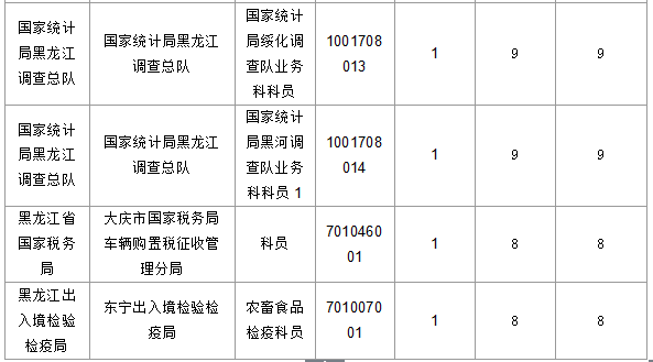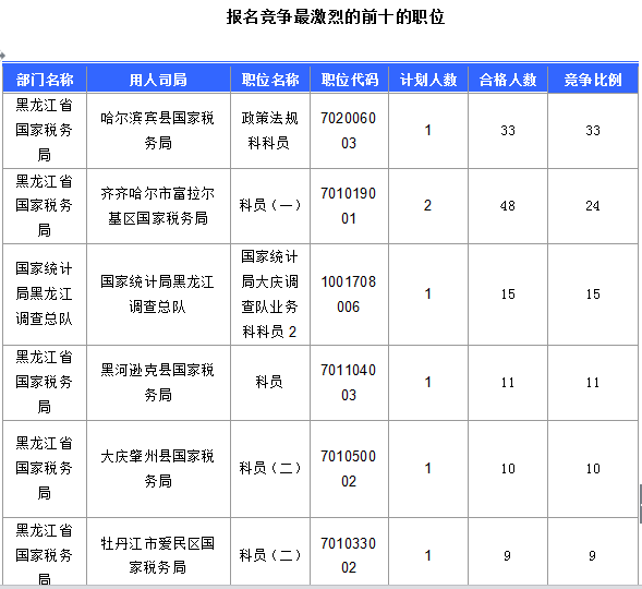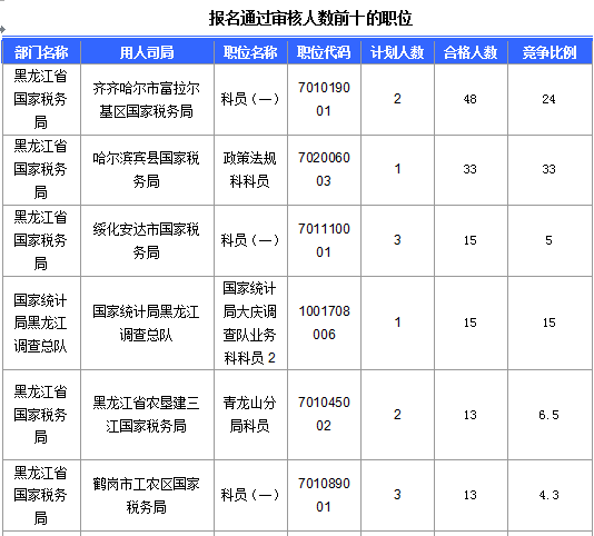 報(bào)名通過審核人數(shù)前十的職位主要集中在黑龍江省國(guó)家稅務(wù)局、國(guó)家統(tǒng)計(jì)局黑龍江調(diào)查總隊(duì)等部門,具體信息如下: