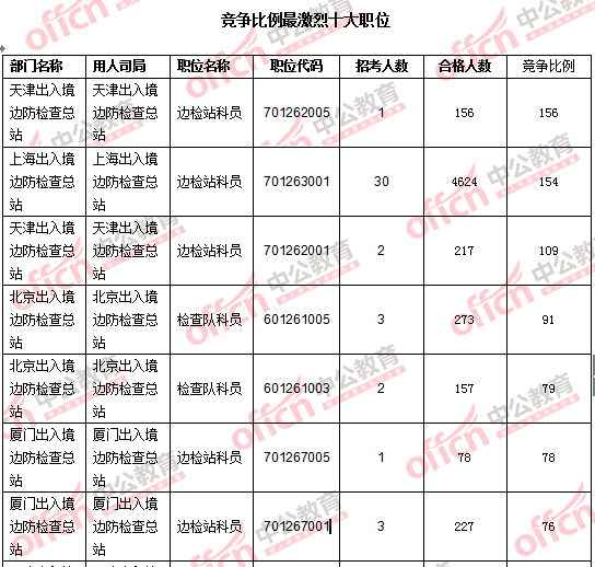 截止發(fā)稿前,競(jìng)爭(zhēng)最激烈的職位為天津出入境邊防檢查總站邊檢站科員(職位代碼701262005)該職位招錄1人,目前已有156人報(bào)名通過審核,競(jìng)爭(zhēng)比高達(dá)156:1。