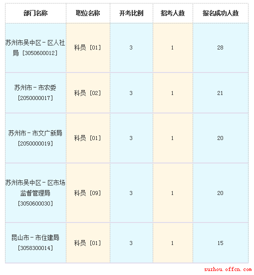 截至12日16時(shí),蘇州市報(bào)名人數(shù)最多的職位為:蘇州市吳中區(qū)-區(qū)人社局科員 [01],一共有28人報(bào)名,競(jìng)爭(zhēng)最激烈的職位也是蘇州市吳中區(qū)-區(qū)人社局科員 [01],招錄1人,報(bào)名人數(shù)為28人,報(bào)名通過(guò)審核人數(shù)前十的職位主要集中在蘇州市吳中區(qū)-區(qū)人社局 [3050600012]、蘇州市市農(nóng)委[2050000017]和市文廣新局[2050000019]、吳中區(qū)市場(chǎng)監(jiān)督管理局[3050600030]、相城地稅局[5050700026]等部門(mén),具體信息如下: