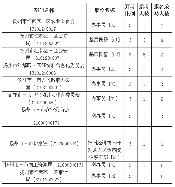 截至11日16時(shí),揚(yáng)州市報(bào)名人數(shù)最多的職位為:揚(yáng)州市江都區(qū)-區(qū)農(nóng)業(yè)委員會(huì)[3101200017]辦事員[01],一共有4人報(bào)名,競(jìng)爭(zhēng)最激烈的職位為揚(yáng)州市江都區(qū)-區(qū)農(nóng)業(yè)委員會(huì)[3101200017]辦事員[01],招錄1人,報(bào)名人數(shù)為4人,報(bào)名通過審核人數(shù)前十的職位主要集中在揚(yáng)州市江都區(qū)-區(qū)公安局 [3101200007]、揚(yáng)州市-市農(nóng)業(yè)委員會(huì)[2100000017],具體信息如下: