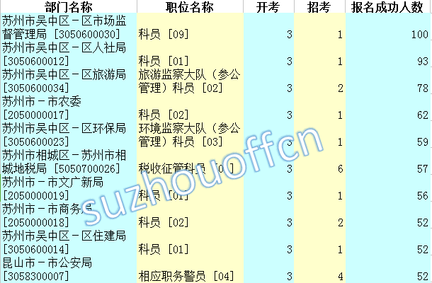截至14日16時(shí),蘇州市報(bào)名人數(shù)最多的職位為:蘇州市吳中區(qū)-區(qū)市場(chǎng)監(jiān)督管理局 [3050600030],一共有100人報(bào)名,競(jìng)爭(zhēng)最激烈的職位也是蘇州市吳中區(qū)-區(qū)市場(chǎng)監(jiān)督管理局 [3050600030],招錄1人,報(bào)名人數(shù)為100人,報(bào)名通過審核人數(shù)前十的職位主要集中在蘇州市吳中區(qū)-區(qū)人社局 [3050600012]、蘇州市吳中區(qū)-區(qū)旅游局 [3050600034]、蘇州市-市農(nóng)委 [2050000017]、蘇州市吳中區(qū)-區(qū)環(huán)保局 [3050600023]等部門,具體信息如下: