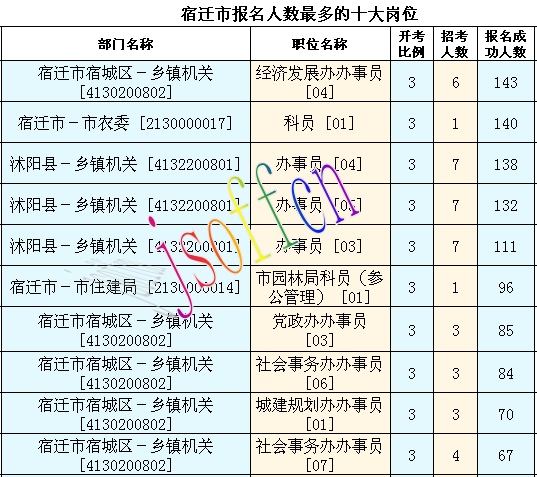 截至16日16時(shí),宿遷市報(bào)名人數(shù)最多的職位為:宿遷市宿城區(qū)-鄉(xiāng)鎮(zhèn)機(jī)關(guān) [4130200802],一共有143人報(bào)名,競爭最激烈的職位為宿遷市-市農(nóng)委 [2130000017],招錄1人,報(bào)名人數(shù)為140人,報(bào)名通過審核人數(shù)前十的職位主要集中在宿遷市宿城區(qū)-鄉(xiāng)鎮(zhèn)機(jī)關(guān) [4130200802]、宿遷市-市農(nóng)委 [2130000017],具體信息如下: