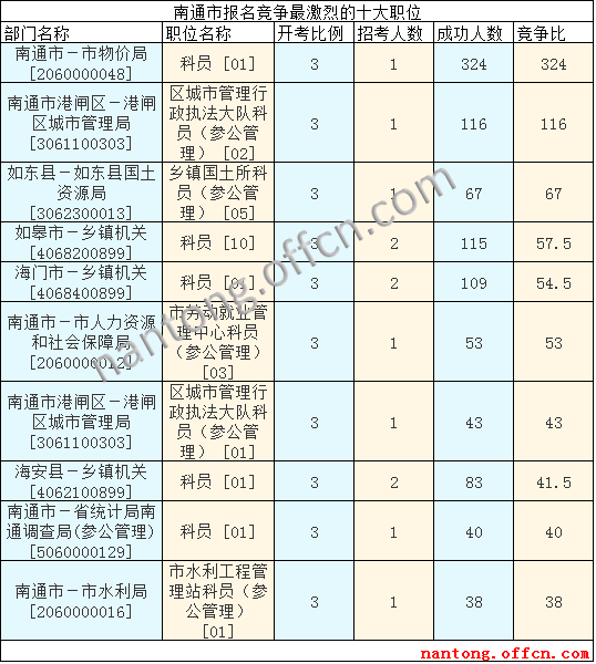 截至16日16時(shí),南通市報(bào)名人數(shù)最多的職位為:科員 [01],一共有324人報(bào)名,競(jìng)爭(zhēng)最激烈的職位為也是這個(gè)報(bào)名最多的科員[01],招錄1人,報(bào)名人數(shù)為324人,報(bào)名通過(guò)審核人數(shù)前十的職位比較集中,主要是南通市區(qū)和縣區(qū)鄉(xiāng)鎮(zhèn)機(jī)關(guān),如南通市-市物價(jià)局[2060000048]、如皋市-鄉(xiāng)鎮(zhèn)機(jī)關(guān)[4068200899],具體信息如下: