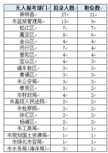 截止到19日18時(shí)報(bào)名結(jié)束,共有83個(gè)職位無(wú)人申報(bào),占總職位數(shù)的4.9%,與去年同期基本持平。據(jù)中公網(wǎng)校統(tǒng)計(jì),崇明縣無(wú)人申報(bào)職位最多,有21個(gè)職位無(wú)人申報(bào),另外,市監(jiān)獄管理局、松江區(qū)、嘉定區(qū)等無(wú)人報(bào)考職位也較多。以下是各部門(mén)無(wú)人報(bào)考情況一覽: