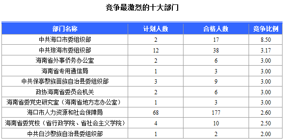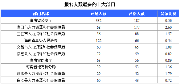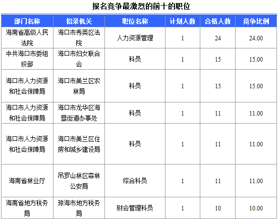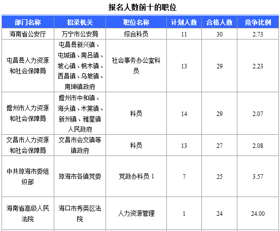 報名通過審核人數前十的職位主要集中在海南省高級人民法院、海口市人力資源和社會局、海南省林業(yè)廳,具體信息如下: