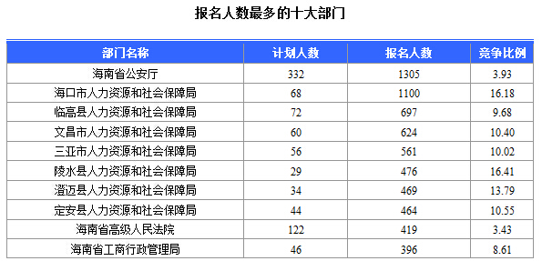 截至16日9時(shí),報(bào)名人數(shù)前三位的部門依次是:海南省公安廳、??谑腥肆Y源和社會(huì)局、臨高縣人力資源和社會(huì)局,三部門報(bào)名總?cè)藬?shù)達(dá)3102人,占報(bào)名總?cè)藬?shù)的24.4%。