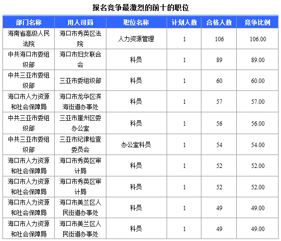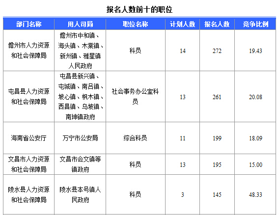 報(bào)名通過審核人數(shù)前十的職位主要集中在各大人力資源廳,具體信息如下: