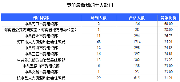 2016海南公務員考試報名數據查看功能于3月16日16時關閉,截至3月16日16時。據海南中公網校統(tǒng)計,總報名人數達17763人,其中行政機關15752人,黨群機關2011人,競爭比例達122:1。仍有50個職位無人報名,平均競爭比例為11.22:1??忌枳⒁膺@并不是最終的報名人數,報名截止是2016年3月18日16:00,確認時間是截至2016年3月18日。