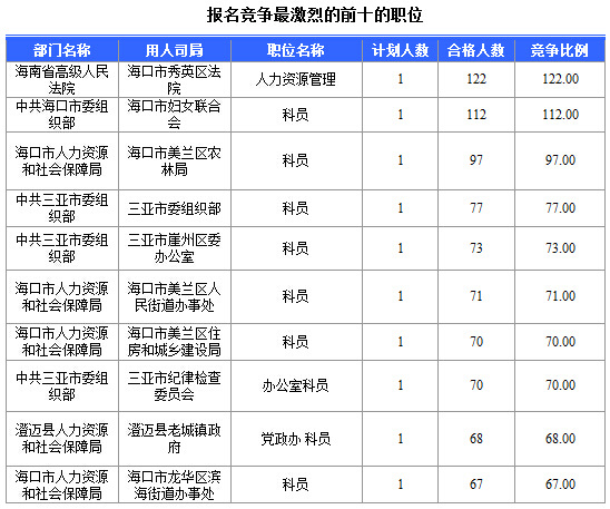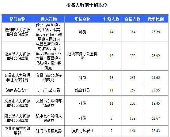 報名通過審核人數前十的職位主要集中在各大人力資源局具體信息如下: