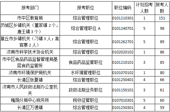 2016年山東省考濟(jì)南市所屬職位中,報(bào)考人數(shù)前三位的職位依次是:市中區(qū)教育局綜合管理職位、歷城區(qū)鄉(xiāng)鎮(zhèn)機(jī)關(guān)(董家鎮(zhèn)2個(gè),唐王鎮(zhèn)3個(gè))綜合管理職位A、章丘市鄉(xiāng)鎮(zhèn)機(jī)關(guān)(刁鎮(zhèn)3人;高官寨2人)綜合管理職位,報(bào)考人數(shù)分別是151、98、89。