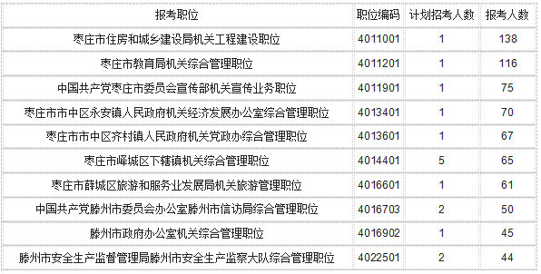 2016年省考報(bào)名棗莊地市所屬的職位中,報(bào)名人數(shù)前三位的職位依次是:滕州市安全生產(chǎn)監(jiān)督管理局滕州市安全生產(chǎn)監(jiān)察大隊(duì)綜合管理職位、滕州市政府辦公室機(jī)關(guān)綜合管理職位、中國共產(chǎn)黨滕州市委員會(huì)辦公室滕州市信訪局綜合管理職位,報(bào)考人數(shù)分別為138人、116人、75人。其中滕州市安全生產(chǎn)監(jiān)督管理局滕州市安全生產(chǎn)監(jiān)察大隊(duì)綜合管理職位競(jìng)爭(zhēng)最為激烈,報(bào)名首日?qǐng)?bào)考人數(shù):招考人數(shù)的比例已達(dá)138:1.