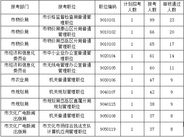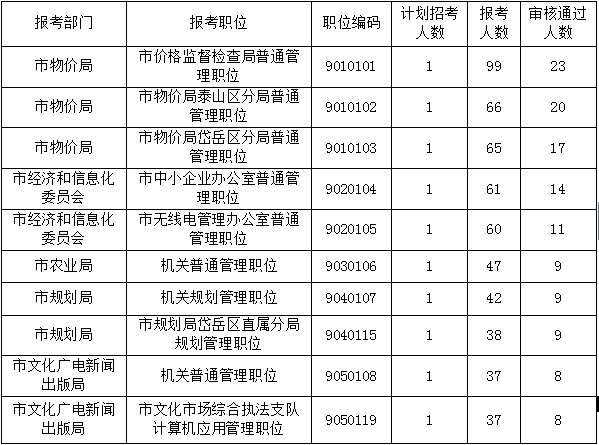 2016年泰安市所屬的職位中,報考人數前三位的職位分別是:市價格監(jiān)督檢查局普通管理職位、市物價局泰山區(qū)分局普通管理職位、市物價局岱岳區(qū)分局普通管理職位,報考人數分別為99、66、65人。