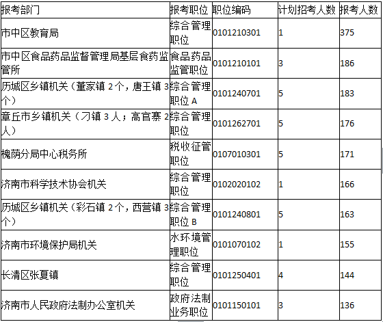 2016年濟(jì)南市所屬的職位中,報名人數(shù)前三位的職位依次是:市中區(qū)教育局綜合管理職位、市中區(qū)食品藥品監(jiān)督管理局基層食藥監(jiān)管所食品藥品監(jiān)管職位、歷城區(qū)鄉(xiāng)鎮(zhèn)機(jī)關(guān)(董家鎮(zhèn)2個,唐王鎮(zhèn)3個)綜合管理職位A,競爭比例依次是:375:1、62:1、183:5。