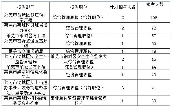 2016年萊蕪市所屬的職位中,報(bào)名人數(shù)最多的職位是:萊蕪市鋼城區(qū)顏莊鎮(zhèn)、辛莊鎮(zhèn)的綜合管理職位(合并職位),萊蕪市萊城區(qū)鳳城街道辦事處的綜合管理職位,萊蕪市萊城區(qū)方下鎮(zhèn)的綜合管理職位A,報(bào)名人數(shù)均大于50。