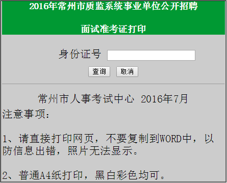 2016江蘇常州市質(zhì)監(jiān)系統(tǒng)事業(yè)單位招聘面試準(zhǔn)考證打印入口