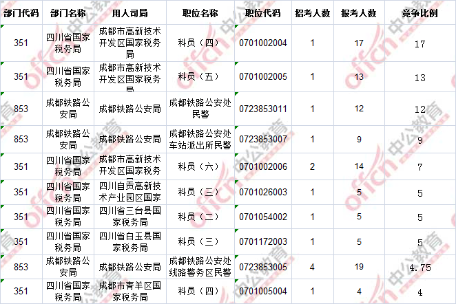截止到15日16時(shí),競(jìng)爭(zhēng)比例的職位為‘四川省國(guó)家稅務(wù)局成都市高新技術(shù)開(kāi)發(fā)區(qū)國(guó)家稅務(wù)局’一職,招錄1人,截止到15日16時(shí)通過(guò)人數(shù)為17人。