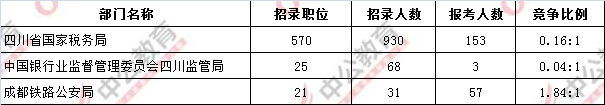 截止到15日16時(shí),通過(guò)審核人數(shù)前三位的部門(mén)依次是:四川省國(guó)家稅務(wù)局,中國(guó)銀行業(yè)監(jiān)督管理委員會(huì)四川監(jiān)管局,成都鐵路公安局,三部門(mén)通過(guò)審核總?cè)藬?shù)達(dá)213人,除去以上三個(gè)部門(mén)外,其他部門(mén)暫無(wú)人通過(guò)審核
