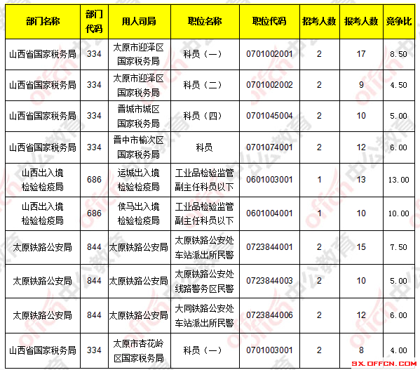 報考人數(shù)前八位的職位主要集中在山西省國家稅務局、山西出入境檢驗檢疫局、太原鐵路公安等部門,具體信息如下: