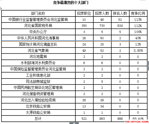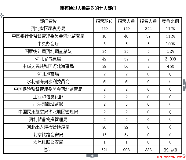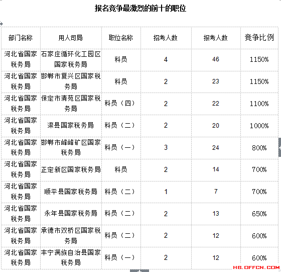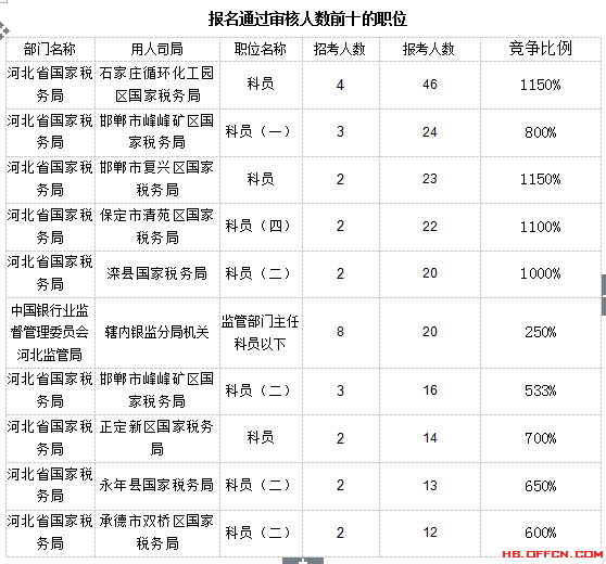 報(bào)名通過(guò)審核人數(shù)前十的職位主要集中在河北省國(guó)家稅務(wù)局、中國(guó)銀行業(yè)監(jiān)督管理委員會(huì)河北監(jiān)管局、中央辦公廳等部門,具體信息如下: