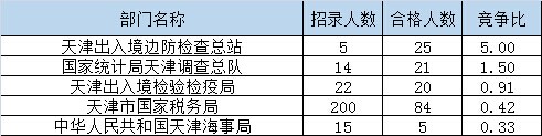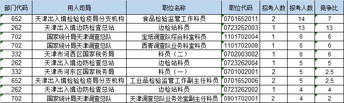 報(bào)名通過審核人數(shù)前十的職位主要集中在天津出入境檢驗(yàn)檢疫局分支機(jī)構(gòu)、天津出入境邊防檢查總站、國(guó)家統(tǒng)計(jì)局天津調(diào)查總隊(duì),具體信息如下: