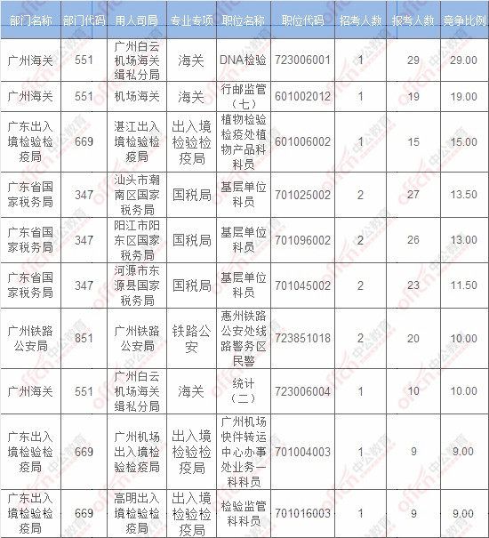 截止到15日16時(shí),競(jìng)爭(zhēng)比例的職位為廣州海關(guān)廣州白云機(jī)場(chǎng)海關(guān)緝私分局DNA檢驗(yàn)一職,招錄1人,截止到15日16時(shí)通過(guò)人數(shù)為29人。