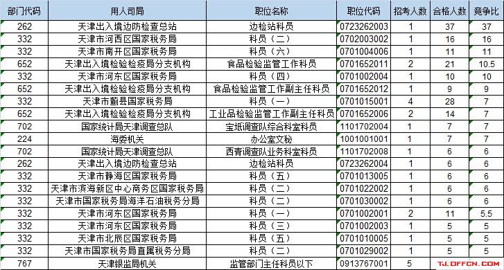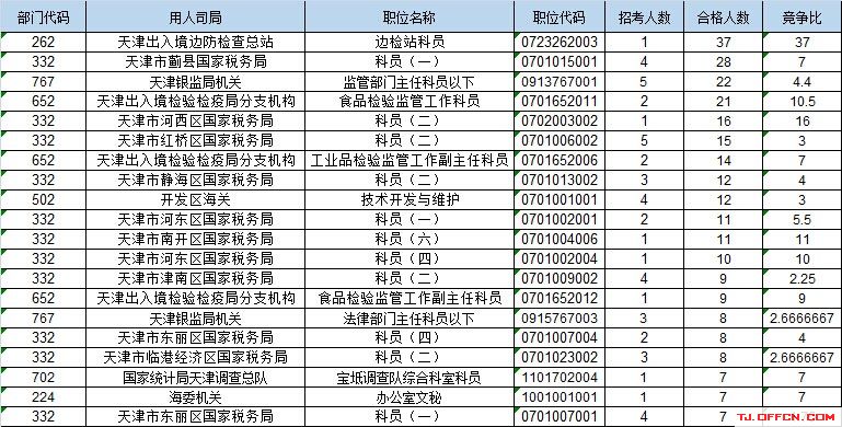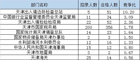 報名通過審核人數(shù)前十的職位主要集中在天津出入境邊防檢查總站、天津市薊縣國家稅務局、天津銀監(jiān)局機關,具體信息如下: