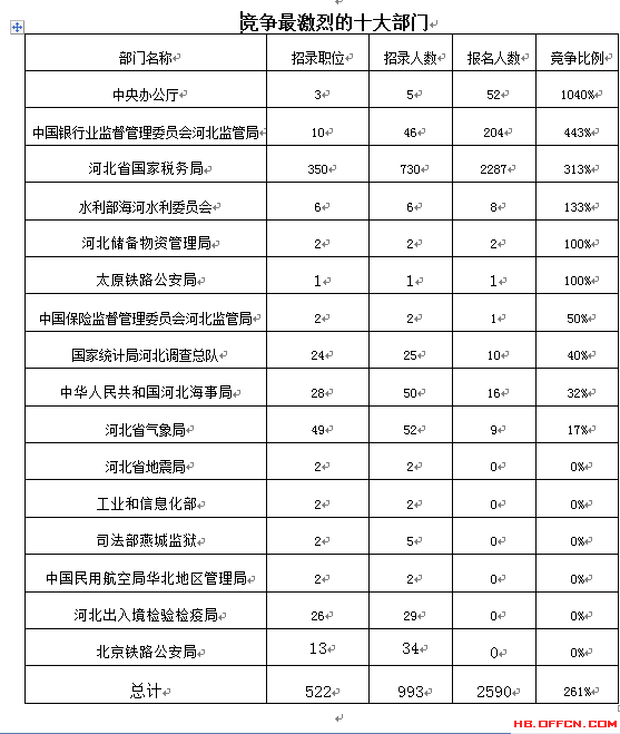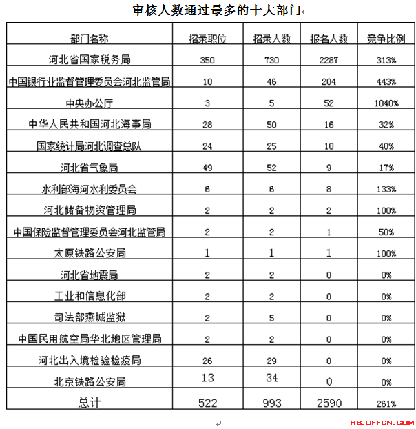 截止到16日16時(shí),通過審核人數(shù)前三位的部門依次是:河北省國(guó)家稅務(wù)局、中國(guó)銀行業(yè)監(jiān)督管理委員會(huì)河北監(jiān)管局、中央辦公廳,三部門通過審核總?cè)藬?shù)達(dá)2543人,占通過審核總?cè)藬?shù)的98.1%。