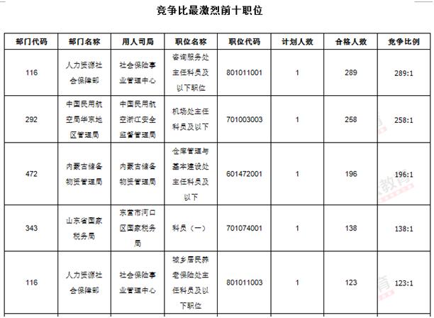 在競爭力最強(qiáng)前十職位中,有兩個(gè)職位均來自人力資源社會(huì)部,其中人力資源社會(huì)部社會(huì)保險(xiǎn)事業(yè)管理中心咨詢服務(wù)處主任科員及以下職位(代碼801011001)這一職位取代了遼寧儲備物資管理局保衛(wèi)處主任科員及以下(職位代碼601474002)的“寶座”地位,成為今日最難考職位,競爭比例已高達(dá)289:1,該職位處于中央機(jī)關(guān),前景廣闊,且招錄條件相對寬松,很有可能制造“千里挑一”的局面。