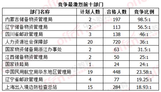內(nèi)蒙古儲備物資管理局取代遼寧儲備物資管理局,躍居為競爭最激烈前十部門榜單首位,僅招錄2人,已經(jīng)197人通過審核,競爭比高達98.5:1, 遼寧儲備物資管理與局四川省郵政管理局也有上升趨勢,未來到底誰主沉浮,請考生們繼續(xù)關(guān)注中公網(wǎng)校每日國考報名數(shù)據(jù)分析。
