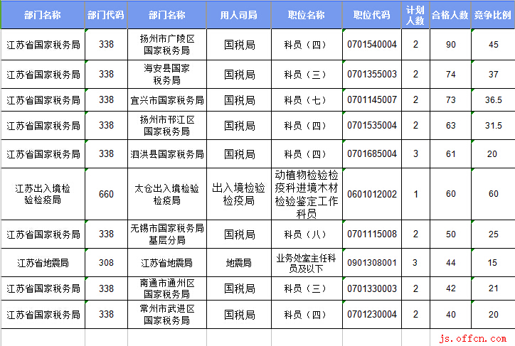 報(bào)名通過審核人數(shù)前十的職位主要集中在江蘇省國家稅務(wù)局、江蘇出入境檢驗(yàn)檢疫局、江蘇省地震局等部門,具體信息如下: