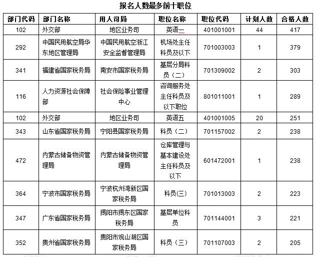 報(bào)名人數(shù)最多前十職位的合格人數(shù)均在200以上,外交部地區(qū)業(yè)務(wù)司英語(yǔ)一(職位代碼401001001)計(jì)劃招錄44人,目前已有417人報(bào)名,蟬聯(lián)報(bào)名人數(shù)最多前十職位榜單“寶座”,的原因除了外交部自身的魅力外,也與招錄基數(shù)較大有關(guān)。