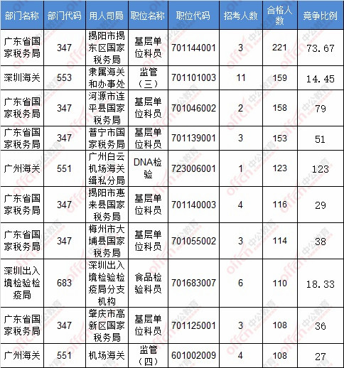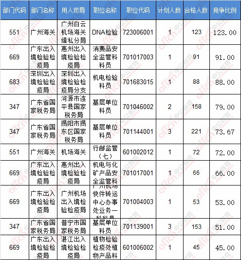 截止到17日8時,競爭比例的職位為廣州海關(guān)廣州白云機場海關(guān)緝私分局DNA檢驗一職,招錄1人,截止到17日8時通過人數(shù)為123人。