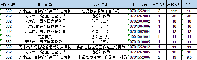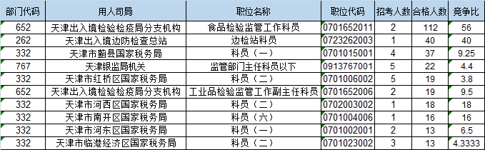 報(bào)名通過審核人數(shù)前十的職位主要集中在天津出入境檢驗(yàn)檢疫局分支機(jī)構(gòu)、天津出入境邊防檢查總站、天津市薊縣國(guó)家稅務(wù)局,具體信息如下: