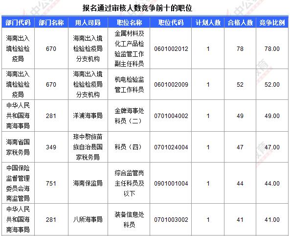 截止到17日16時(shí),已有137個(gè)職位破0,且熱門(mén)職位人數(shù)競(jìng)爭(zhēng)已經(jīng)開(kāi)始激烈,其中報(bào)名人數(shù)最多的職位為:海南出入境檢驗(yàn)檢疫局,機(jī)電檢驗(yàn)監(jiān)管工作科員,共報(bào)名78人,競(jìng)爭(zhēng)比例已高達(dá)78:1!
