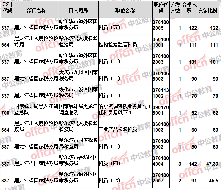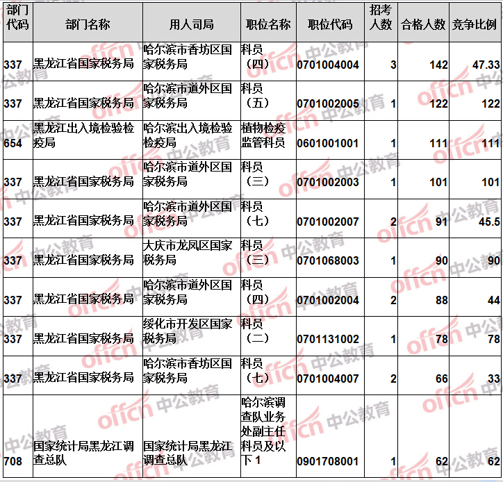 報(bào)名通過(guò)審核人數(shù)前十的職位主要集中在黑龍江省國(guó)家稅務(wù)局、黑龍江出入境檢驗(yàn)檢疫局、國(guó)家統(tǒng)計(jì)局黑龍江調(diào)查總隊(duì)等部門,具體信息如下: